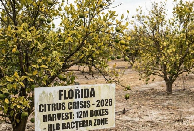 A safra de laranjas na Flórida enfrenta seu colapso mais dramático desde 1930, com a previsão de apenas 12 milhões de caixas em 2026. A bactéria Citrus Greening (HLB) devastou a indústria, exigindo terapias de “UTI agronômica” para evitar a extinção total.