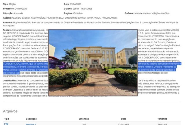 Moção de Repúdio à recusa de comparecimento da diretora-presidente da Morada do Sol Turismo, Eventos e Participações S/A, Leonora Ferreira, após da convocação da Câmara. O documento é de autoria dos vereadores da bancada do PT (Alcindo Sabino, Fabi Virgílio, Filipa Brunelli, Maria Paula e Paulo Landim) e de Guilherme Bianco (PCdoB);