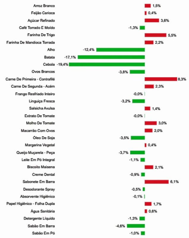 Ainda sobre o mês em análise, os itens com maior aumento percentual foram: 1) Carne de primeira – contrafilé (+8,3%); 2) Sabonete em barra (+6,1%); 3) Farinha de trigo (+5,5%); 4) Açúcar refinado (+3,6%) e 5) Molho de tomate (+3,0%). E os produtos com maior decréscimo percentual foram: 1) Cebola (-19,4%); 2) Batata (-17,1%); 3) Alho (-12,4%); 4) Sabão em barra (-14,6%); 5) Ovos brancos (-3,8%).