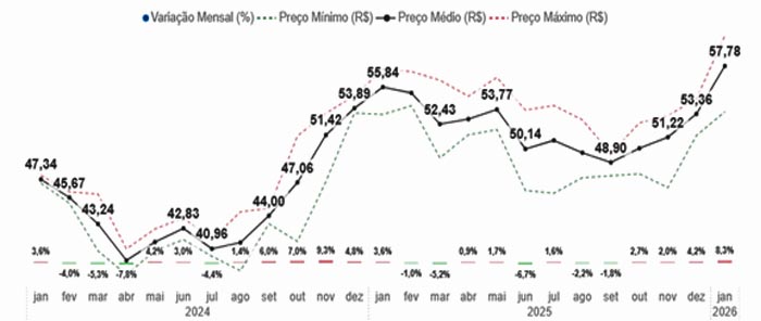 Com relação aos itens da cesta, 15 dos 32 produtos apresentaram aumento de preço entre os meses de fevereiro de 2025 e janeiro de 2026. Os itens que apresentaram maior alta acumulada foram: 1) Margarina vegetal (+14,89%); 2) Sabonete em Barra (+13,73%); 3) Creme dental (+11,32%); 4) Café Torrado e Moído (+10,86%); 5) Carne de Segunda – Acém (+9,62%). Os que apresentaram as maiores reduções foram: 1) Alho (-43,93%); 2) Arroz branco (-25,58%); 3) Queijo muçarela – peça (-20,84%); 4) Cebola (-16,03%); 5) Açúcar Refinado (-8,63%).