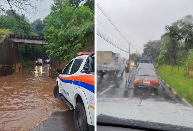 Na Avenida Maurício Galli, três veículos apresentaram pane elétrica devido ao alagamento. Com apoio da Defesa Civil e dos agentes de trânsito, os carros foram retirados por guincho para manutenção.