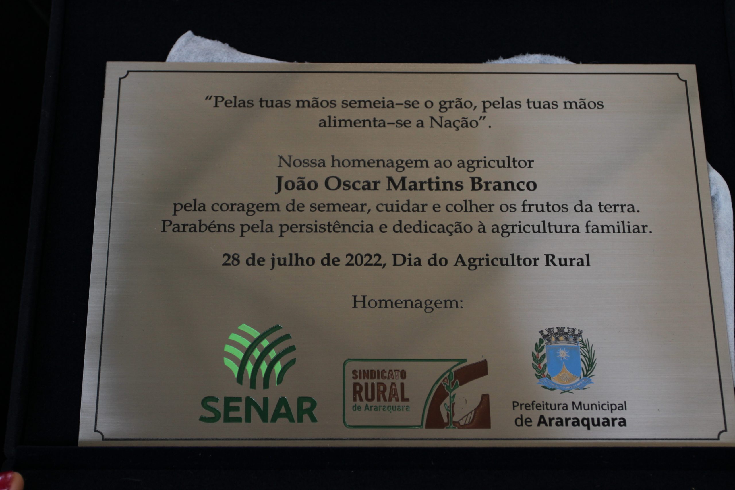 O cartão entregue a Orlando ressalta esse reconhecimento: “Prezado Orlando Govoni Filho, o trabalho no campo fez de você um vencedor e neste Dia do Agricultor quando o homenageamos pela sua luta, o fazemos de maneira simples, mas extremamente merecida.