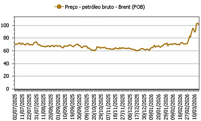 Gráfico 1 – Preço por barril do petróleo bruto Brent (FOB) até 16/03/2026