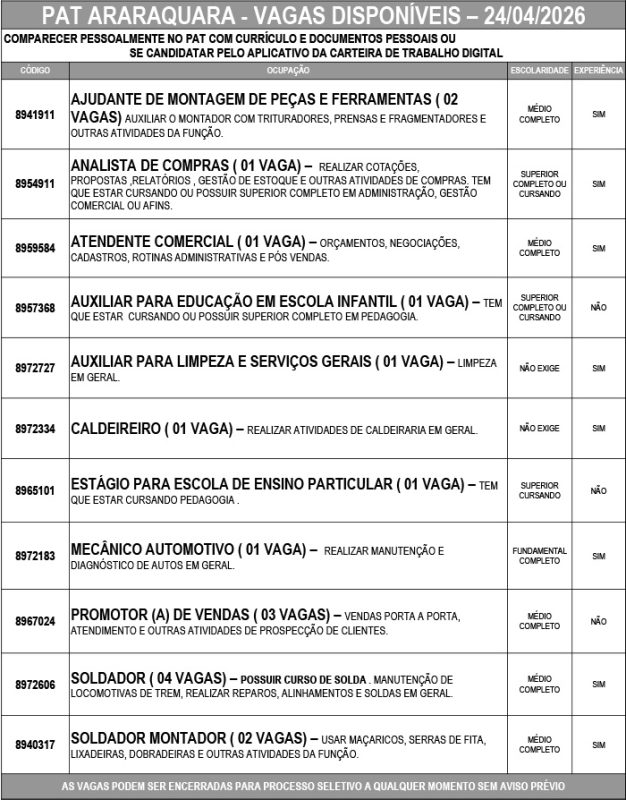 O Posto de Atendimento ao Trabalhador (PAT) está com 18 oportunidades de emprego em Araraquara nesta sexta-feira (24).