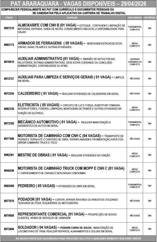 O Posto de Atendimento ao Trabalhador (PAT) está com 32 oportunidades de emprego em Araraquara nesta quarta-feira (29).