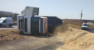 Caminhão tomba na SP-322 e carga de farelo do bagaço da...