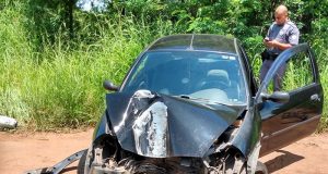 O pneu do carro estourou após o condutor passar em um buraco; perdeu a direção e bateu em um poste