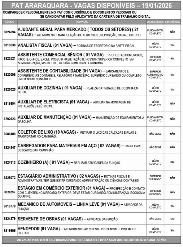 O Posto de Atendimento ao Trabalhador (PAT) está com 46 oportunidades de emprego em Araraquara nesta segunda-feira (19).